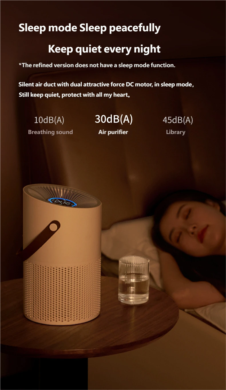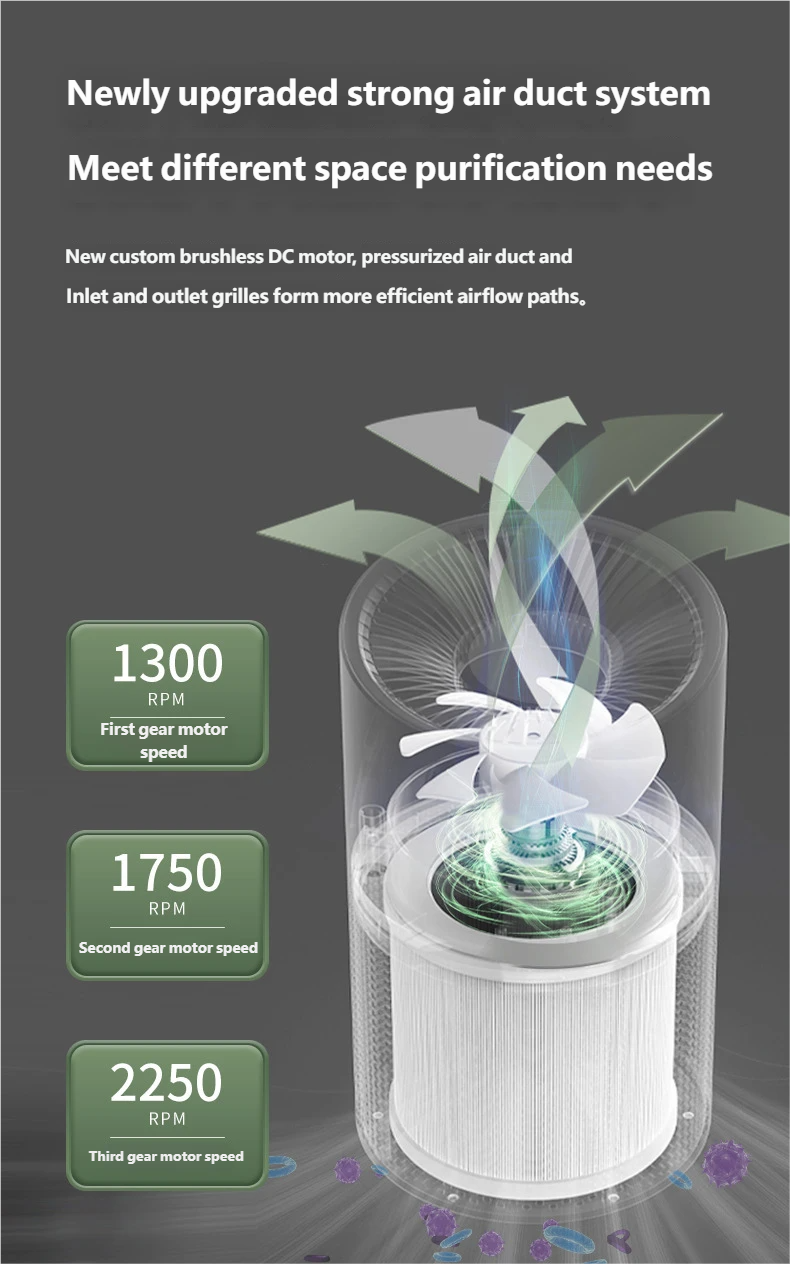 Brushless DC Motor, 3-Speed Adjustment: Customized brushless DC motor ensures quiet and stable operation. Offers 3-speed settings (1300/1750/2250 RPM) with a high CADR of 71m³/h to meet various purification needs. Sleep mode operates at only 30dB(A), silently guarding your sleep.