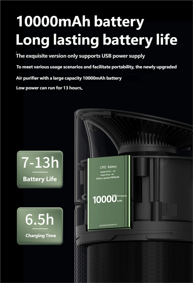 10000mAh Large Battery, Long-Lasting: Built-in 10000mAh large capacity battery, operates continuously for 7-13 hours on low speed, freeing you from power cords. USB powered with a portable leather handle, perfect for office desks or outdoor camping.