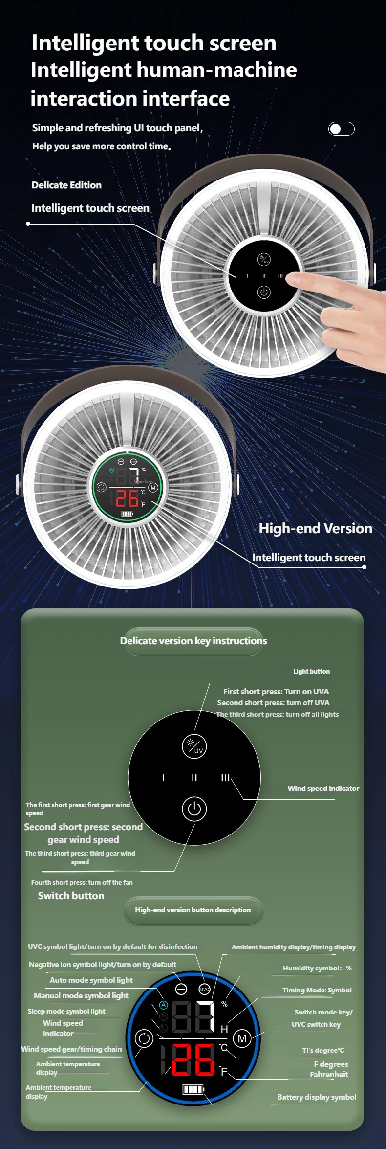 Deluxe Edition: Simple touch panel, supports light control (UVA sterilization), fan speed switching, and timing function (60/180/360 minutes).