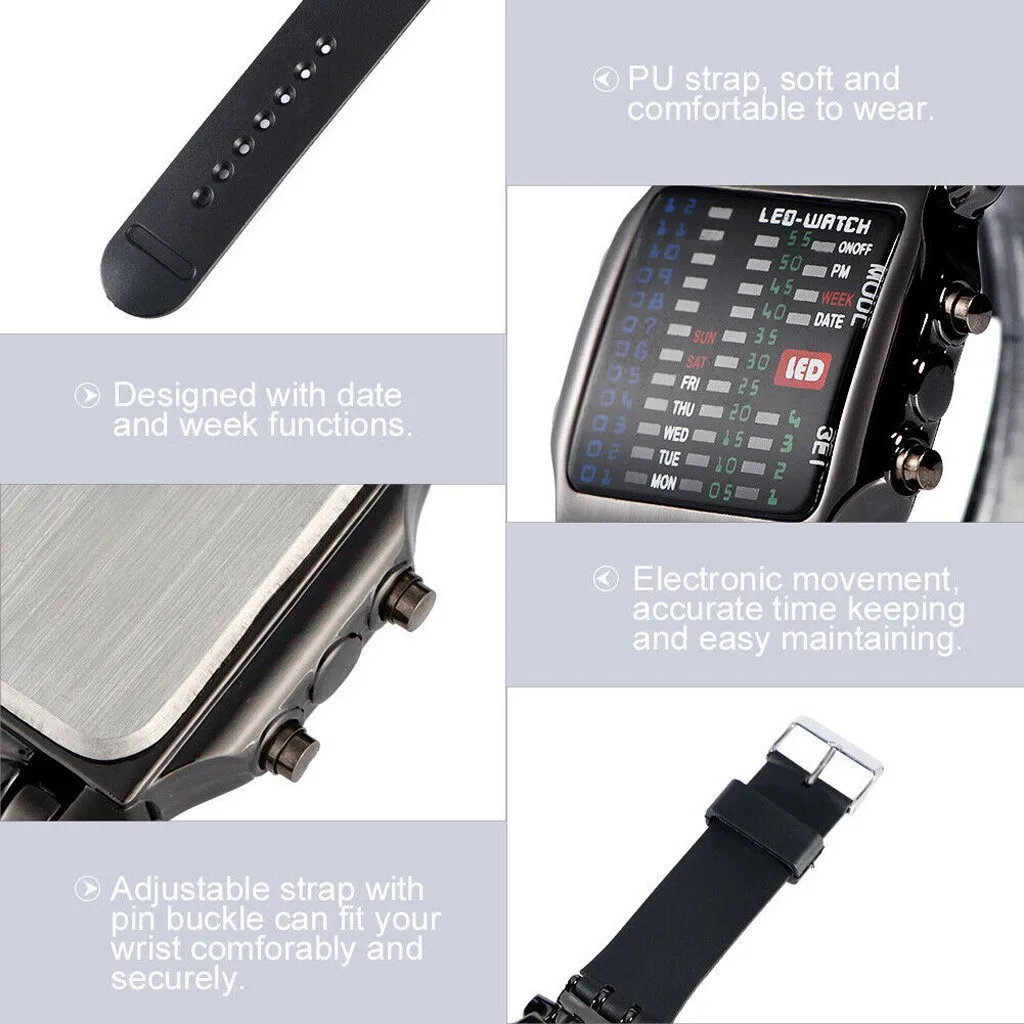 Creative LED watch featuring a unique crab-shaped binary display and multifunctional design.